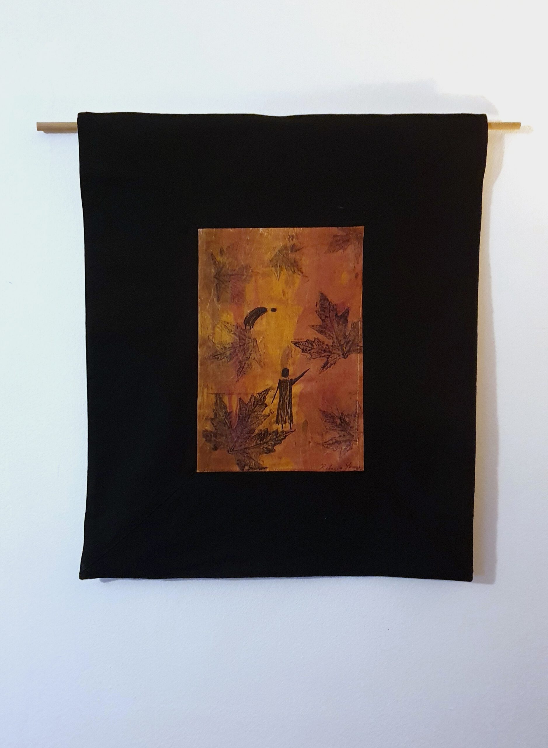 Measuring 47 cm x 55 cm, this textile artwork is finished with a black cotton border that frames the composition beautifully and enhances the vivid Autumn colours. On the reverse, a neatly stitched fabric channel allows you to insert a dowel stick or wooden baton, making it effortless to hang and display your artwork straight away.