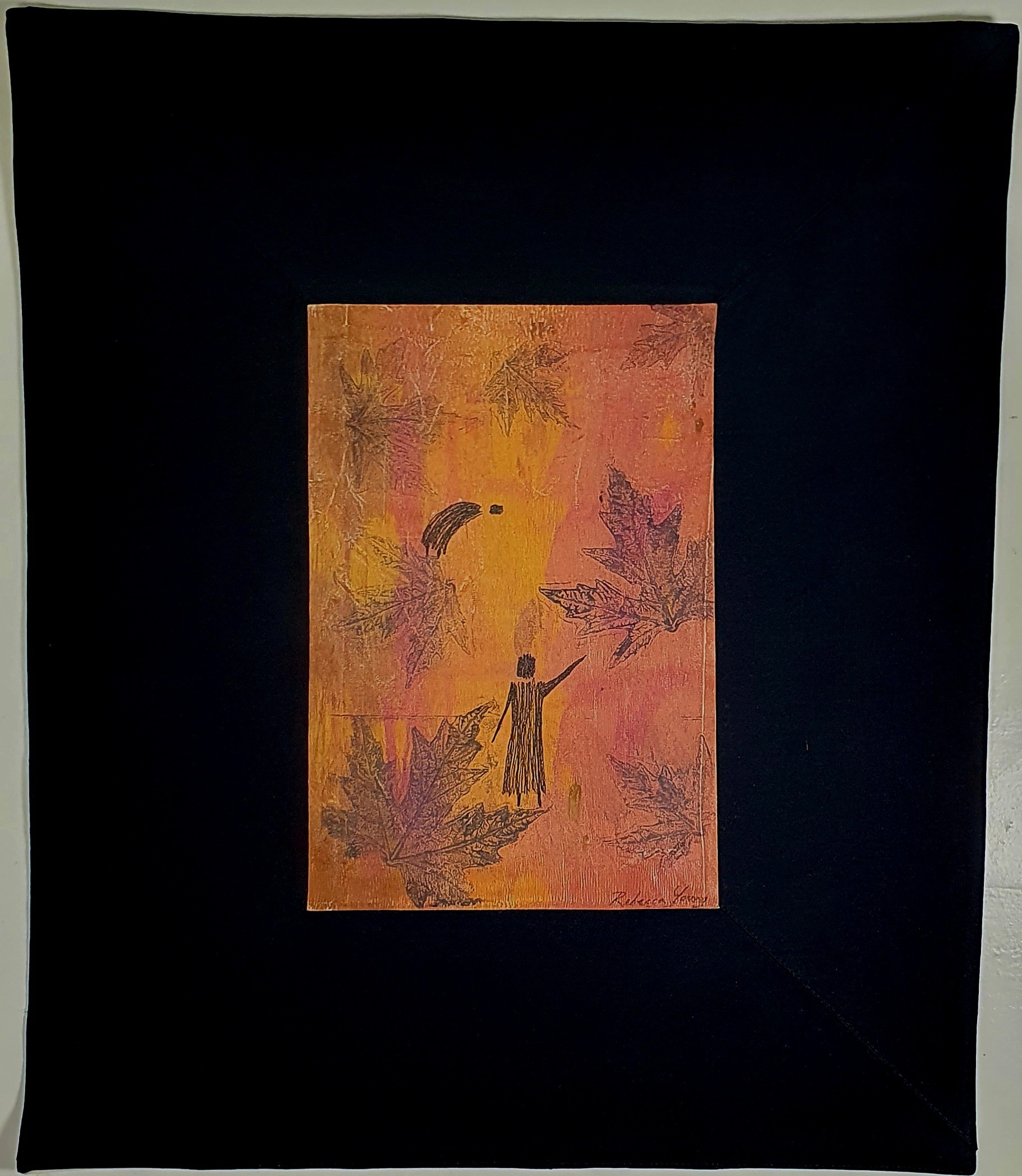 The background begins with a botanical monoprint created on a gel plate, capturing the delicate shapes and organic textures of real leaves and foliage. Layered on top are two embroidered figures, stitched using free-motion embroidery techniques. The rich Autumn palette—featuring warm russets, ochres, and earthy tones—adds depth and seasonal charm.
