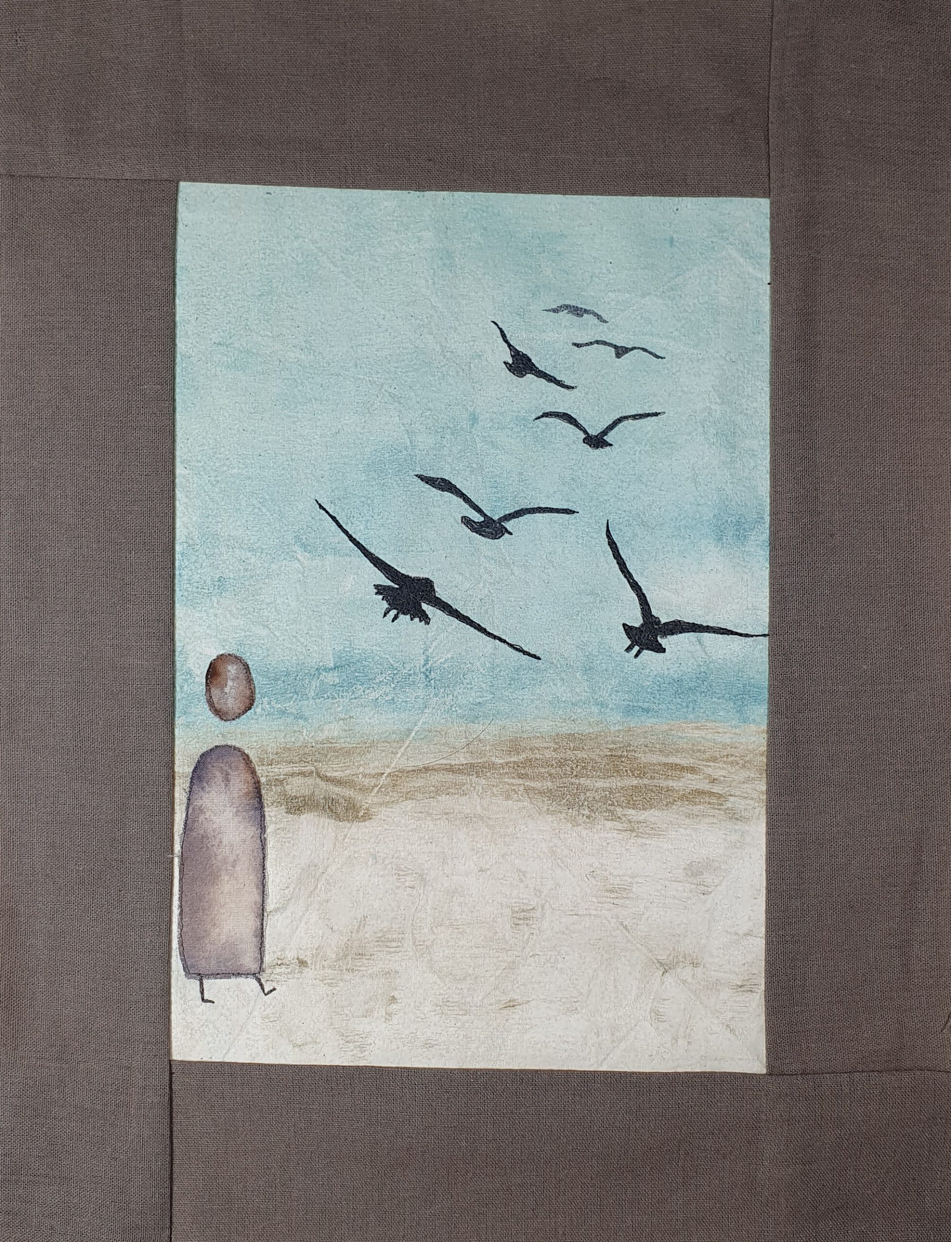 A solitary figure, hand-painted in ink and carefully appliquéd onto the surface, walks along the shoreline as birds lift into the air ahead. The birds are stitched using free-motion embroidery, adding movement and delicate detail that brings the scene to life.