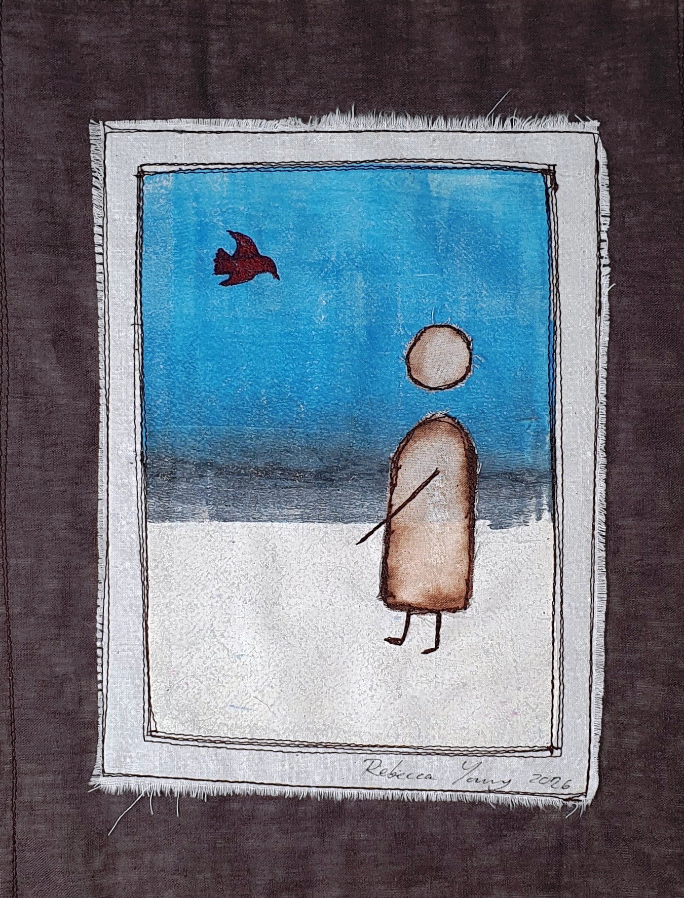 A solitary figure, hand-painted in ink and carefully appliquéd onto the surface, stands still beneath an open sky. Above, a single red bird—stitched using free-motion embroidery—flies across the scene, adding a striking focal point and a sense of movement.